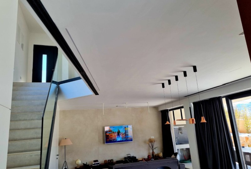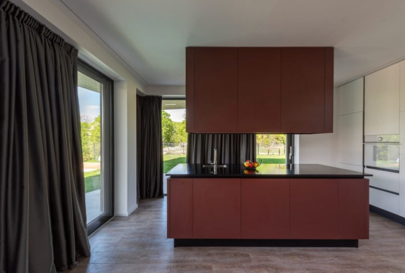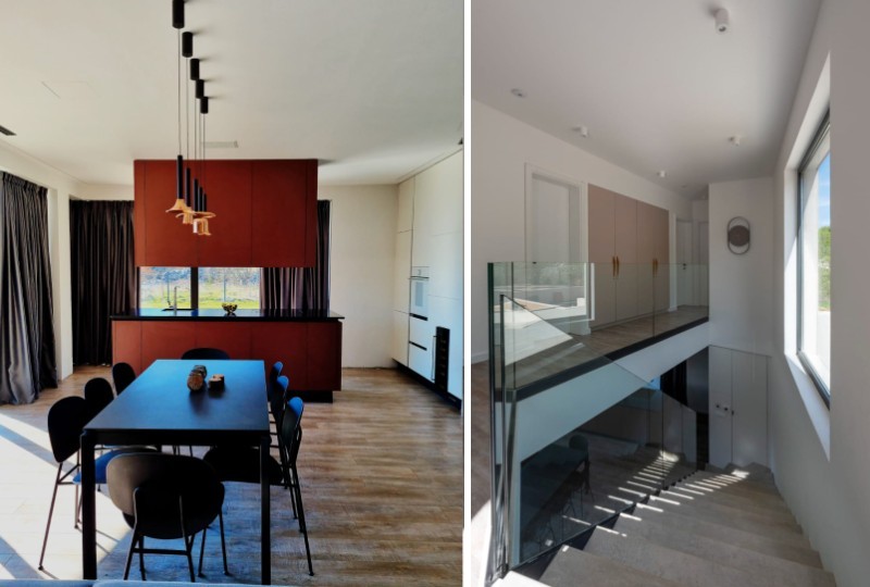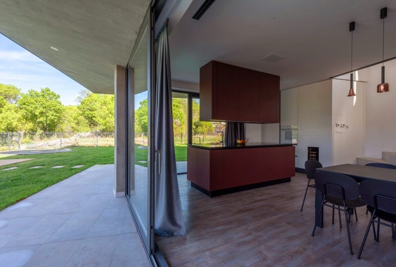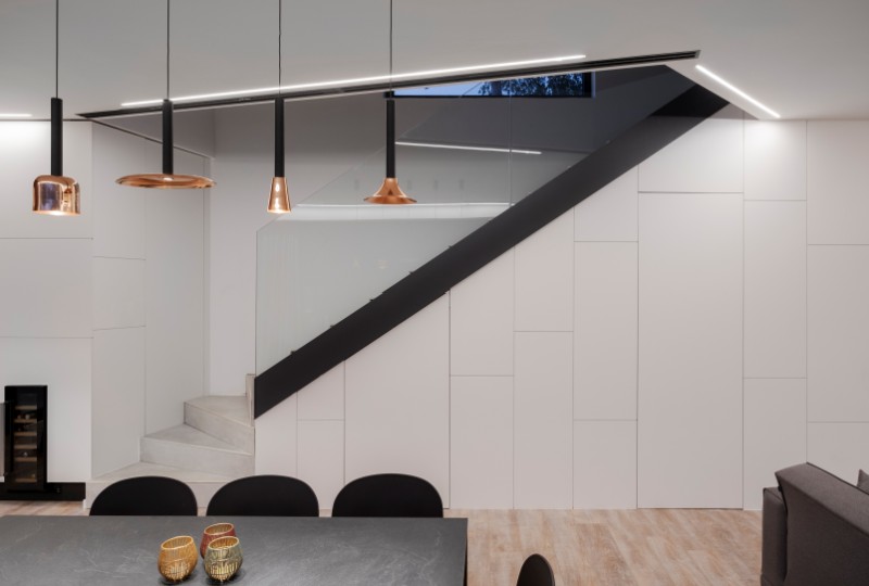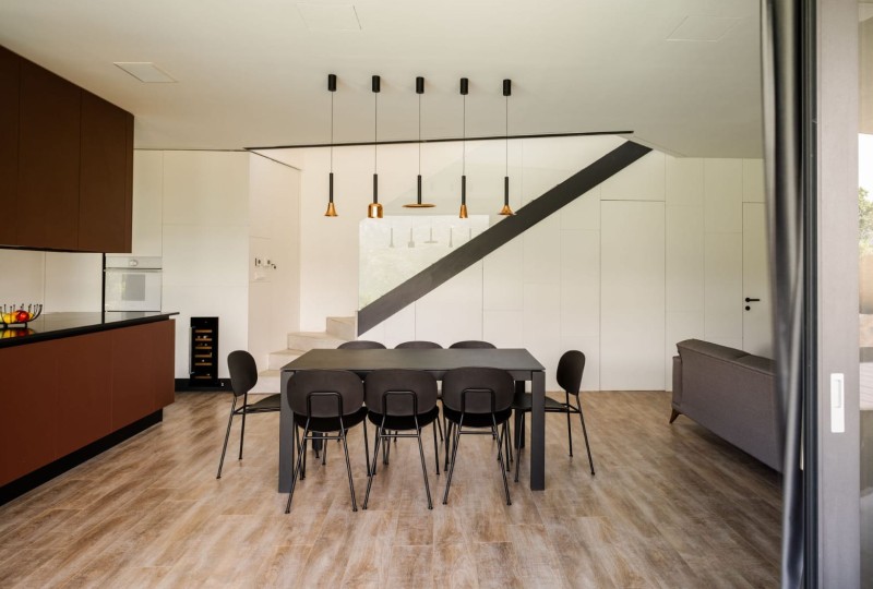 U prizemlju je smješten moderan dnevni boravak s prostranom kuhinjom kojom dominira kuhinjski otok upečatljive boje. Osim malog toaleta, ispod stubišta nalaze se i skriveni ormari s ostavom i praonicom. Isprekidana igra linija između ormara i vrata daje jedan diskretan ali karakteran štih cjelokupnom prizemlju.